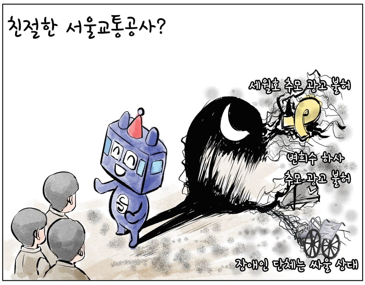 이 발언이 퍼지자 인터넷에서는 여태 괜히 장애인들 편을 들어줬다며 공격이 시작됐습니다. 유튜브에서는 사이버 렉카(교통사고가 나면 달려오는 렉카처럼 온라인 공간에서 사건사고, 각종 논란을 발 빠르게 정리하여 소개하는 영상으로 조회수를 올리는 크리에이터)들이 전국장애인차별철폐연대를 사이코패스 악마집단으로 규정하며 선정적인 영상을 만들어 올리기 바빴습니다. 그러자 기레기들은 커뮤니티 게시물과 유튜브 지라시를 옮기며 장애인들의 시위가 얼마나 경제적으로 민폐를 끼치고 있는지에 관한 기사를 쏟아냈습니다. 여론의 뭇매를 견디지 못해 결국 장애인 단체는 2월 23일부로 시위를 잠정 중단했습니다. 그런데 지난 3월 17일 YTN은 지하철을 운영하는 서울교통공사가 장애인 단체를 싸울 상대로 보고 언론 플레이 방침을 정한 문서를 폭로하는 뉴스를 내보냈습니다. 서울교통공사의 대응 문건에는 지하철 시위를 벌이는 장애인 단체의 약자 이미지로 인해 공사 측이 여론전에서 불리하다면서 싸워서 이겨야 한다는 내용으로 가득했습니다. 심지어 서울교통공사는 이 문건을 장애인 단체에 대한 대응지침으로서 전체 직원들이 볼 수 있도록 정식으로 공유하기도 했죠.
