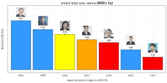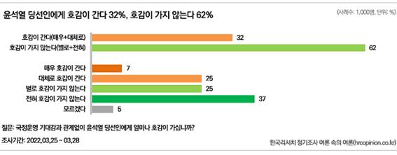 윤석열과 인수위의 경제에 대한 아마추어적인 대처 때문인지 그렇지 않아도 낮은 호감도가 최근 더 떨어졌습니다. 3월 마지막 주 조사에 따르면 윤석열에게 호감이 간다는 응답은 32%로 더 낮아졌고 비호감이라는 응답은 62%로 대폭 높아졌습니다. 국정운영에 대한 기대감도 잘할 것이라는 응답은 그대로인데 반해 못할 것이라는 응답은 더 올라 50%를 넘었습니다.