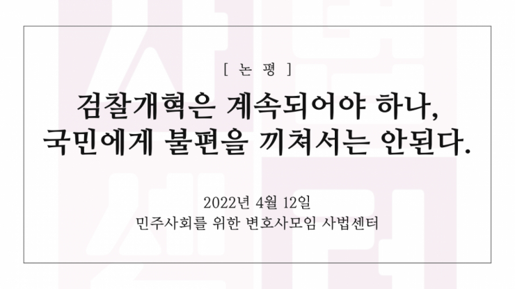 이는 지난 4월 12일 민변 사법센터가 낸 논평과 같은 입장이었습니다. 민변은 "검경수사권조정 및 공수처 등 새로운 제도가 시행된 지 얼마 되지 않았고, 검수완박이 아무리 올바른 방향이라고 하더라도, 여러 가지 검토가 필요하다"며 "경찰의 수사능력과 통제장치는 충분한지, 사건관계인들의 불만과 불평은 없는지 확인하고 보완해야 한다"고 지적했습니다. 또한 "검찰이 수행하고 있는 소위 6대 범죄를 경찰이나 공수처가 수행할 경우 수사의 공백을 채울 대안은 무엇이고, 경찰과 공수처의 수사역량을 확보할 방안은 무엇인지, 나아가 공수처가 출범한 지 얼마 안 되는 시점에 중대범죄수사청이라는 또 다른 전문수사기관을 만드는 것이 필요불가결한 일인지에 대해서도 평가와 보완이 이뤄져야 한다"고 강조한 바 있습니다. 일반 국민의 입장에서 치열하게 논쟁 중인 법의 세세한 부분을 다 이해하기란 어렵습니다. 이번에는 '검찰 개혁'이라는 국민의 뜻에 부합하면서도 진영 논리에 빠지 말고 정말 국민에게 도움이 되는 방향으로 국회가 제대로 일하길 기대합니다.