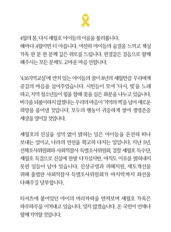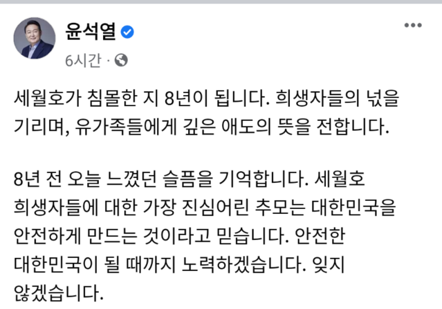 윤석열 당선인 역시 자신의 페이스북을 통해 "세월호 희생자들에 대한 가장 진심어린 추모는 대한민국을 안전하게 만드는 것이라고 믿습니다"라고 말하며 희생자들의 넋을 기리고 유가족들에게 깊은 애도의 뜻을 전했습니다. 대한민국은 좌우와 진영을 가릴 것 없이 세월호 참사의 진상을 규명해야 합니다.