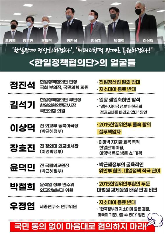 이와 함께 한일정책협의단의 구성원 대다수는 국민이 극렬히 비판해왔던 굴욕적인 위안부 합의의 실질적 책임자들로 임명해놨습니다. 이번엔 대체 어떤 굴욕적인 친일 합의를 해주려고 저러는 건지 걱정이 앞섭니다. 위안부 합의의 실무자를 포함시킨 건 일본이 원하는 대로 다 해주겠다는 사인으로 읽힐 가능성이 농후합니다.