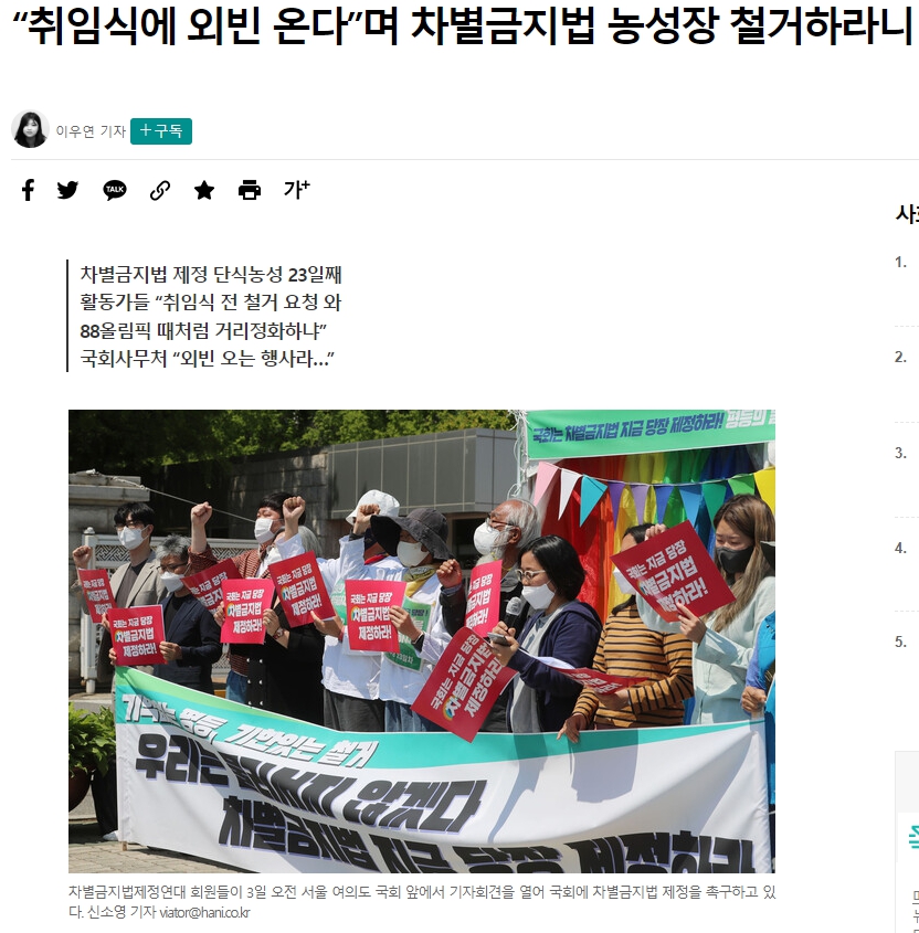 교통 통제로 인한 불편함도 문제지만 대통령 취임식을 준비하는 과정에 더 큰 문제가 불거졌습니다. 지난 5월 3일 오전 국회 앞에서 차별금지법 제정을 요구하던 시민들은 기자회견을 열었습니다. 국회사무처로부터 대통령 취임식 전에 농성장을 자진 철거하라는 통보를 들었기 때문입니다. 국민의 대리인이자 국민의 요구를 입법하는 기관 앞에서 시민들이 정당한 요구를 하고 있는데 외빈이 보기에 민망하다고 철거하라뇨? 86 아시안게임, 88 올림픽 준비하던 신군부 시절로 돌아간 느낌입니다. 국민을 대하는 인식 자체가 쌍팔년도 시절로 퇴행한 듯합니다. 비판 여론이 커지자 국회사무처는 철거를 통보한 게 아니라 협조해달라고 요청한 것이라고 변명했는데요, 그 과정에서도 대통령 취임식은 외빈들도 오는 공식적 행사인데 농성장이 좋게 보이진 않기 때문에 경찰과 구청, 대통령 경호처와 협의해 취임식 당일이라도 철거해달라는 협조 요청을 한 것이라며 취임식을 치르고 나서 다시 농성할 수 있도록 하겠다는 의사를 차별금지법제정연대쪽에 구두로 전달했다고 말해 빈축을 사기도 했습니다. 이들은 자기네가 국민의 기본권인 집회, 결사의 자유를 허락하고 말고 할 수 있는 위치에 있다고 착각하고 있는 건 아닐까요? 외국인의 눈치를 보는 건 둘째 치더라도 민주국가에서 시위가 흉하게 보일 것이라고 생각하는 걸 보면 군사독재 시절과 별반 다를 게 없어 보입니다. 참으로 할 말을 잃게 됩니다.