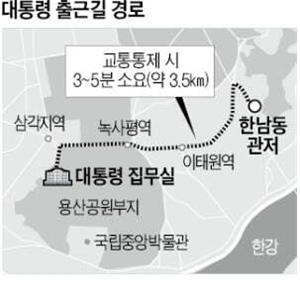 서빙고동, 한강로동, 한남동 등은 국민의힘 후보 윤석열을 압도적으로 지지한 지역입니다. 윤석열을 지지하며 이런 불편함을 감수해야 할 것을 예상했을지 모르겠습니다. 서초동 집에서 출발한 대통령 차량은 시속 30킬로미터 이상 유지하도록 교통을 통제하게 됩니다. 용산 집무실까지 거리가 7킬로미터 정도 되기 때문에 15분 정도 소요된다고 합니다. 외교부 장관 공관의 리모델링 작업이 마무리되기까지 한 달 정도는 시민들이 불편을 느낄 수밖에 없는 상황입니다. 물론 그 이후로도 출퇴근을 아예 하지 않는 이상 교통 통제가 없는 상황은 생기지 않습니다. 한남동 외교부 장관 공관에서 집무실까지 3.2킬로미터 시간상으로는 5분 정도 거리라고는 해도 그 사이에 어떤 일이 생길지는 장담하지 못합니다.