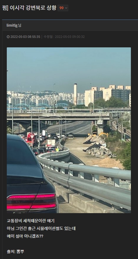 이날 교통체증의 원인은 윤석열의 대통령 취임 후 출퇴근 동선 경호 점검 작업이었습니다. 인수위와 경찰 측이 대통령 관사로 쓸 계획이었던 육군참모총장 공관과 대통령 집무실로 예정된 국방부 청사로 가는 길목을 통제하는 일종의 교통영향평가를 실시한 겁니다. 경찰은 VIP 경호와 관련된 사안이라 구체적 정보를 확인해줄 수 없다는 말만 되풀이했다고 하죠. 이러한 교통 통제는 수차례 반복될 것이라고 알려졌습니다. 인수위와 청와대 경호처 등이 윤석열이 서초동 자택에서 출퇴근할 경우 동선을 점검하고 있었기 때문입니다. 슬픈 예감은 빗나가는 법이 없죠. 5월 들어 발생한 교통체증 역시 이 윤석열 당선인의 출퇴근 교통통제 시뮬레이션 탓이었습니다. 퇴임식이 열린 오늘부터 이런 교통체증은 반복되고 경우에 따라서는 더 심각할 수도 있습니다. 한남동과 이태원 일대 차로는 넓지도 않고 우회로도 별로 없습니다. 앞서 말씀드린 강변북로와 올림픽대로는 말할 것도 없고요. 이쪽 도로가 막히면 서울 교통이 연쇄적으로 막히게 됩니다. 백번 양보해서 일반 시민이야 불편함을 감수한다 하더라도 긴급 차량인 구급차나 소방차 진입을 막지는 않을지 걱정입니다.