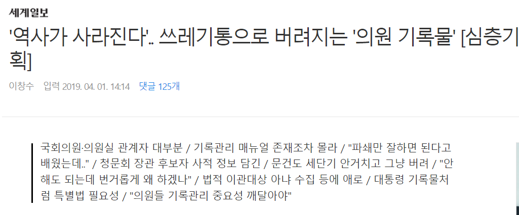 지난 2019년 《세계일보》 보도에 의하면 국회의원 의원실 관계자 대부분이 "기록 관리요? 파쇄만 잘하면 된다고 배웠는데..."라고 답했다고 합니다. 2016년 국회기록보존소가 만든 국회의원 기록관리 매뉴얼이 있지만 매뉴얼의 존재 자체를 모르고 알더라도 무시하고 있다는 얘기였습니다. 공개하는 자료라 하더라도 자기 치적인 경우에 한해 공개하는 수준입니다. 전부 기록으로 남기면 그 기록이 부메랑으로 돌아와 불리하게 작용할 수 있다는 우려 때문입니다. 이 때문에 현재의 기록물 관리에 대해 문제의식을 가지고 있는 의원이라 할지라도 법안 발의를 위해 자기네 당 의원들조차 설득할 자신이 없다고 털어놓습니다.