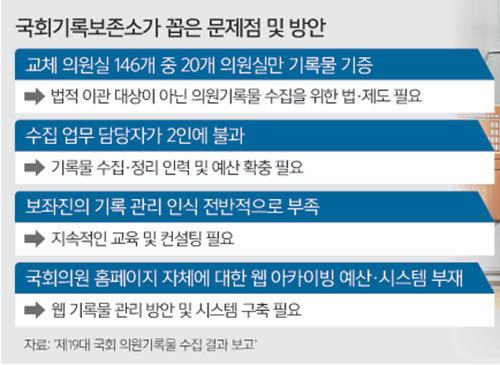 지난 2019년 《세계일보》 보도에 의하면 국회의원 의원실 관계자 대부분이 "기록 관리요? 파쇄만 잘하면 된다고 배웠는데..."라고 답했다고 합니다. 2016년 국회기록보존소가 만든 국회의원 기록관리 매뉴얼이 있지만 매뉴얼의 존재 자체를 모르고 알더라도 무시하고 있다는 얘기였습니다. 공개하는 자료라 하더라도 자기 치적인 경우에 한해 공개하는 수준입니다. 전부 기록으로 남기면 그 기록이 부메랑으로 돌아와 불리하게 작용할 수 있다는 우려 때문입니다. 이 때문에 현재의 기록물 관리에 대해 문제의식을 가지고 있는 의원이라 할지라도 법안 발의를 위해 자기네 당 의원들조차 설득할 자신이 없다고 털어놓습니다.