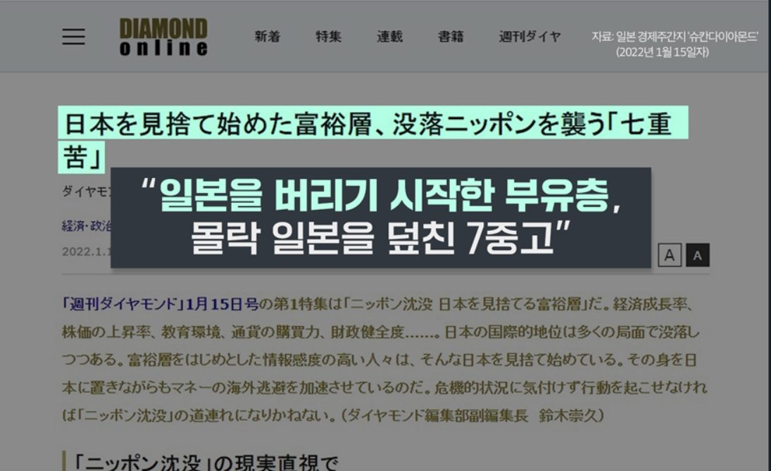 지난 1월 13일 KBS는 <‘역대급 엔저’라 쓰고, ‘日 경제추락의 악순환’이라 읽는다>라는 보도를 통해 일본의 경제 회복이 점점 멀어지고 있다고 전했습니다. 일본의 유력 경제지 《주간 다이아몬드》가 <일본을 버리기 시작한 부유층>이란 제목의 특집 기사를 실은 상황도 보도했습니다. 일본이 GDP, 주가, 엔화, 교육환경 등 다양한 측면에서 추락하고 있다는 내용인데요, 여기에는 일본 부자들이 일본을 버리고 떠난다는 내용이 담겨 있습니다. 미국의 투자은행 JP모건도 일본 엔화 약세가 지속할수록, 일본 자본이 해외로 빠져나갈 가능성이 크다고 지적했다고 하죠.