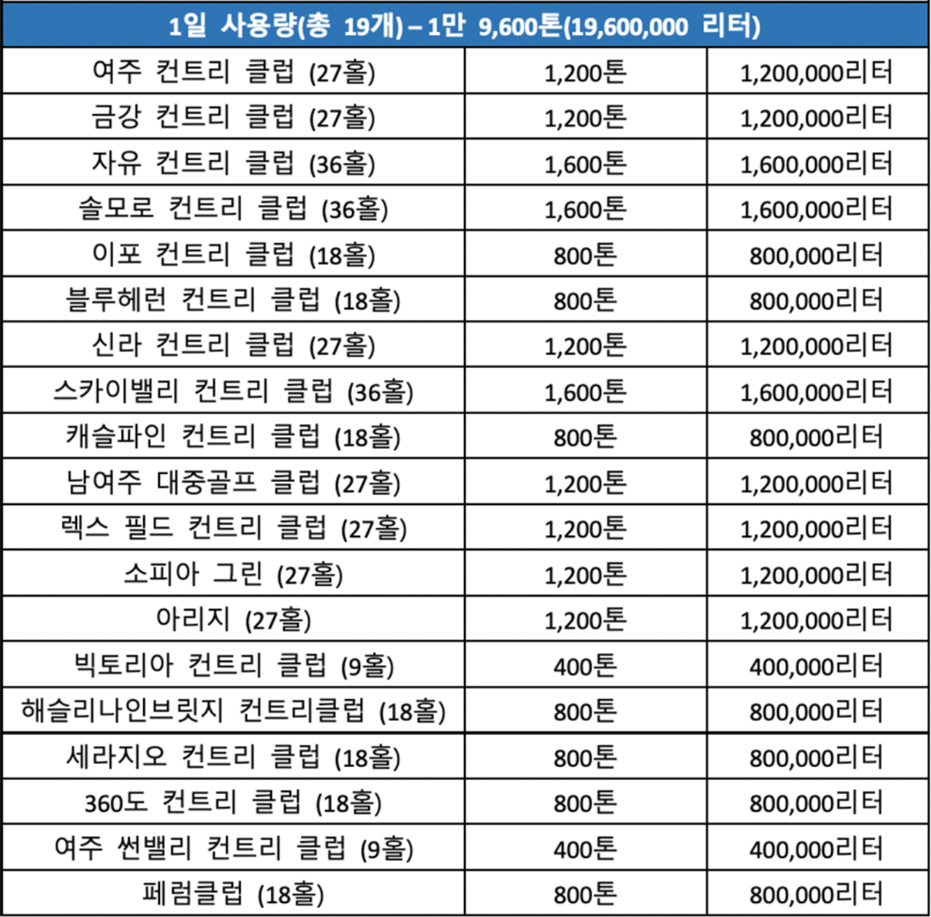 소양강댐은 올 초부터 지속해서 방류량이 줄었으나 팔당댐의 방류량은 일정했습니다. 수도권의 저수량은 상시로 2500만 명의 식수를 공급하기 위해 일정하게 공급하는 반면 상류 지역인 소양강 댐 지역 주민은 소외됐다는 게 환경운동가들의 지적입니다. 한편 우리나라 기후에 잘 맞지도 않는 골프장이 지방 곳곳에 들어찬 것도 문제죠. 싸이 콘서트에 사용되는 300톤의 식수가 논란이 되자 일부 누리꾼은 골프장은 한 곳에서만 하루에 1000톤이 넘는 물을 펑펑 쓴다며 문제를 제기하기도 했으니까요. 아래 도표는 여주시에 있는 골프장의 1일 물 사용량을 정리한 것입니다.
