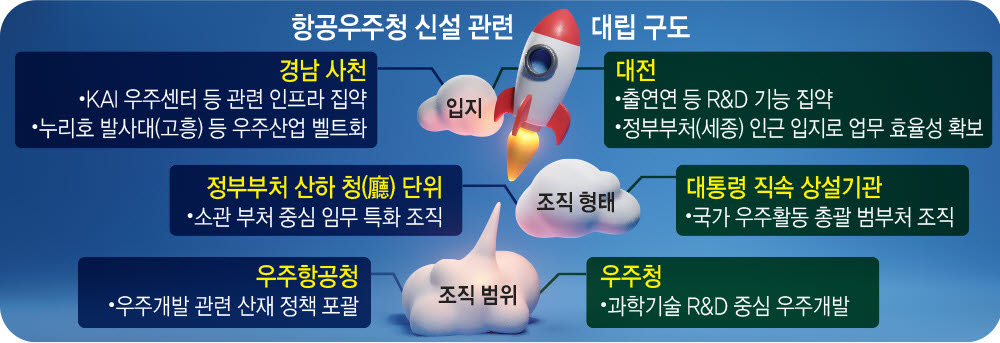 벌써 항공우주청에 대한 이견이 나오고 있습니다. 윤석열은 공군기지 등이 있는 경남 사천에 항공우주청을 설치한다고 약속했지만 관련 기관은 반발하는 모양새입니다. 대덕 연구단지 카이스트를 비롯한 항공우주 관련 민간 기업들은 물론이고 이들이 자리한 대전시 등도 반발하고 있죠. 앞서 말씀드린 대로 항공우주청이 설립되더라도 운영 방식이나 인사 문제를 놓고 정치권의 새로운 갈등 요인이 될 가능성이 큽니다.