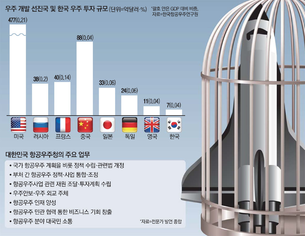 그런데 윤석열 대통령이 설립을 약속한 항공우주청의 운영방식을 보면 불안함이 듭니다. 현재 국방부, 과학기술정보통신부, 방위사업청, 항공우주연구원 등 각 부처에 흩어진 우주 정책 업무를 한데 모아 컨트롤타워 역할을 맡긴다는 구상인데요, 이를 정부부처 산하에 둘 것인지 독립기관으로 운영할 것인지에 대한 판단을 유보하며 사실상 민간이 우주 사업을 주도하게 할 방침으로 알려졌습니다.