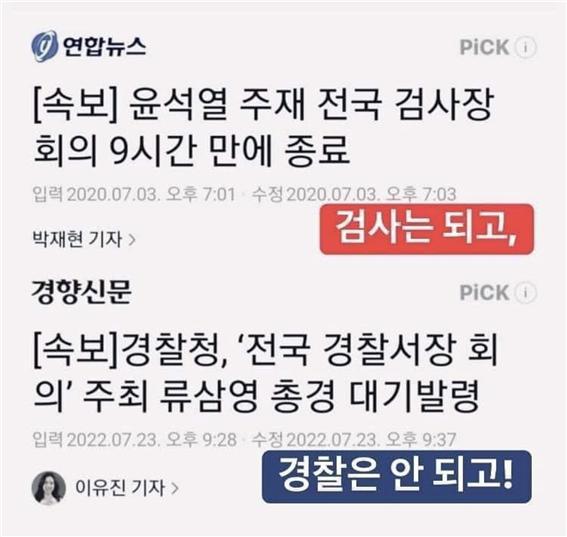 '박적박'에 이어 '윤적윤'이 되는 걸까요? 일선 경찰들이 이번 사태를 보면서 반발하는 이유 중 하나는 "왜 검찰은 되고 경찰은 안 되냐"는 겁니다. 윤석열과 국민의힘은 올해 초 검찰청법, 형사소송법 개정 국면에서 검찰 인사방침과 수사권조정 반발, 법무부 장관 수사 지휘 거부 등을 이유로 평검사 회의, 부장검사 회의, 검사장 회의, 고검장 회의까지 무려 일곱 차례에 걸쳐 전국 대부분의 검사가 참석해 잇달아 열린 검찰의 집단행동을 지지한 바 있습니다. 이런 회의를 열었다고 징계를 받거나 감찰을 받은 검사는 없습니다. 그런데 이와 똑같은 취지로 처음으로 열린 경찰서장 회의에 대해서는 2시간도 안 돼 징계와 감찰 결정을 내렸으니 황당하지 않겠습니까? 윤석열 정부가 '내로남불'의 이중잣대를 들이댄다는 비판을 면할 수 없는 이유입니다. 정말 이렇게까지 해서라도 검찰독재를 하고 싶다는 속마음이 표현된 건가 싶어서 보는 사람의 낯이 부끄러울 지경입니다.