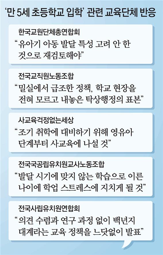 무엇보다 이 정책은 예전에 여러 정부에서 연구되었으나 문제가 있었기 때문에 폐기된 것입니다. 그런데 새로운 연구가 이뤄지거나 뚜렷한 환경 변화가 없는 상황에서 갑자기 과거의 정책을 다시 꺼냈기 때문에 학부모들은 분노를 금하지 못했습니다. 과거 진보와 보수 정부를 가리지 않고 연구가 추진되었으나 결과적으로 만 5세 초등학교 취학제는 보류해야 할 정책으로 결론이 났으니까요. 아이들을 초등학교에 일찍 보내기보다 만 5세에 필요한 것은 유치원 교육의 확대이지 초등학교 조기입학이 아닙니다. 유아 시기 교육을 공교육화하는 방안이 중요합니다. 세계적으로 봐도 5세 취학이 OECD 38개국 중 4개국, G10 11개국 중 1개국에 불과하다는 사실만 봐도 상식에서 벗어난다는 것을 알 수 있죠. 그런데도 박순애 교육부 장관은 기존 연구를 뒤집을 만한 근거도 없이, 충분한 소통도 없이 느닷없이 졸속으로 정책을 발표했습니다. 윤석열 정부의 이런 행보에는 교육을 백년대계로 보기보다는 취학 연령 하향으로 사교육 시장을 넓히려고 하는 쪽의 로비를 받은 것이 아닐지 의심되는 구석이 있습니다.