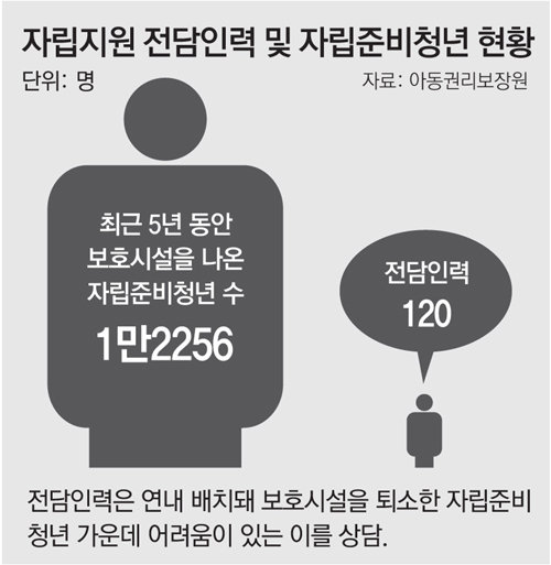 정부가 자립을 돕는 전담요원을 두고 있긴 해도 전국적으로 300명뿐입니다. 퇴소자가 해마다 2500명씩 나오는데 말입니다. 이 때문에 지자체에서 정착 지원금을 800만 원으로 올리고 지원 전담 인력을 120명 더 뽑는 방안을 추진 중이라고 하지만 실질적인 대책이 되지는 못합니다. 자립준비청년들이 심리적으로 정서적으로 믿고 의지하면서 삶의 중요한 결정을 상의할 수 있는 인력이 절대적으로 부족한 게 가장 큰 문제라고 전문가들은 지적합니다.