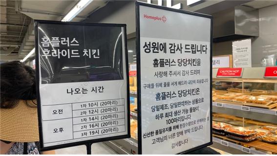 홈플러스의 당당치킨은 오전 두 차례, 오후 세 차례, 이렇게 하루 총 다섯 번에 걸쳐 판매하고 있습니다. 시간대별로 판매하는 수량은 20마리로 제한되어 있습니다. 하루 100마리면 그렇게 많지 않은 듯 보이지만, 원래 마트는 치킨만 전문적으로 튀기는 점포가 아니고 치킨 전담 노동자가 있는 것도 아니라는 데 문제가 있습니다.