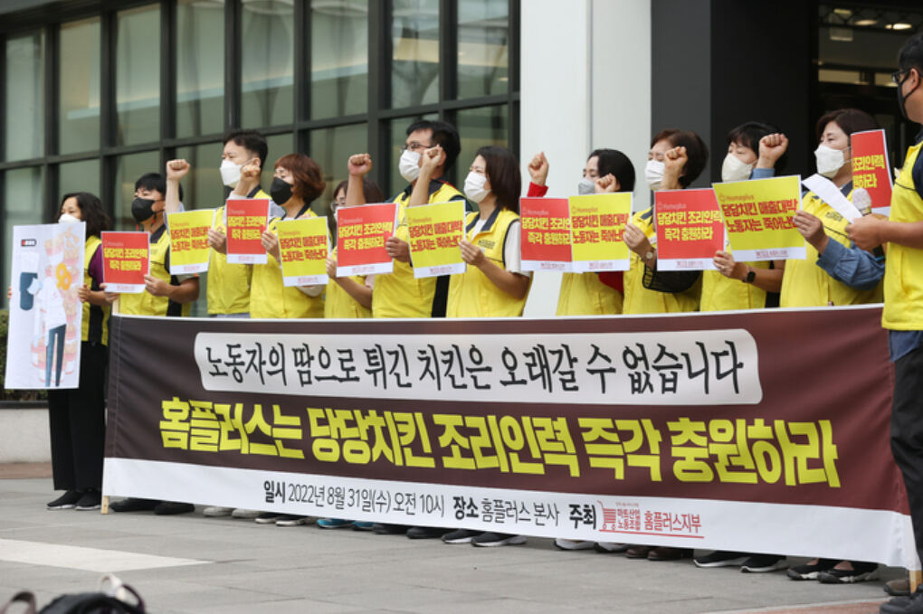 그런데 홈플러스의 경우 노동자들이 기존에 하던 오븐구이, 닭강정, 초밥 등 70가지가 넘는 메뉴를 만들어내면서 당당치킨까지 추가로 튀겨내야 하는 상황에 내몰렸습니다. 홈페이지에서 들어온 주문까지 만들어 포장해야 하죠. 이렇게 홈플러스 노동자들은 인력충원 없이 세 배 늘어난 치킨 물량을 소화해야 해서 한 사람당 평소보다 세 사람 몫의 일을 더 해내야 합니다. 그러다 보니 몇 시간 일찍 와서 몇 시간 더 늦게 가야 하는 생활이 펼쳐지고 있죠.