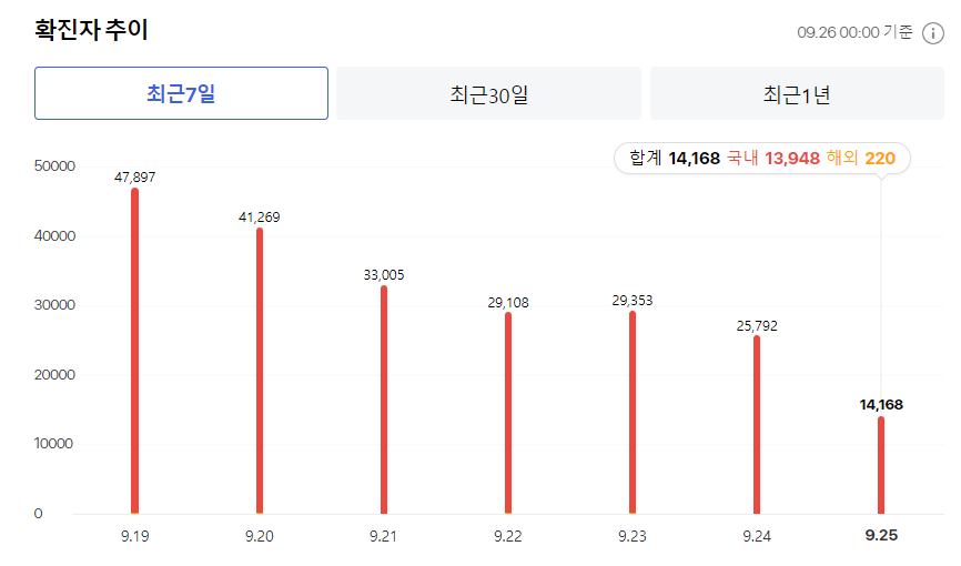 중앙방역대책본부에 따르면 지난 25일 0시 기준 코로나19 신규 확진자 수는 2만 5792명으로 일요일 발표 기준으로는 지난 7월 10일(2만 383명) 이후 11주 만에 최저치를 기록했습니다. 하지만 위중증과 사망자는 여전히 높은 수준을 유지하고 있습니다. 위중증 환자는 416명으로 전날(418명)보다 2명으로 다소 줄었지만, 코로나19로 사망한 환자는 73명으로 직전일보다 10명 증가했기 때문입니다. 정부가 방역 정책을 완화하면서 코로나 19 출구전략에 속도를 낼 것이란 전망이 나오는데요, 주의를 기울이고 경계심을 풀지 말아야 합니다. 정부도 코로나19 감염의 책임을 외주 돌리듯 국민에게 떠넘기려 한다는 느낌을 주지 않도록 코로나 상황 통제에 만전을 기할 때입니다.
