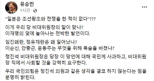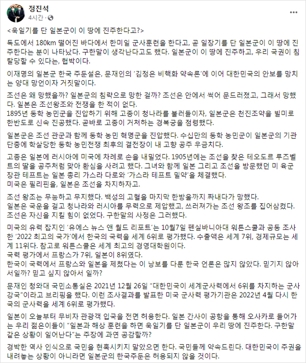 11일 국민의힘 정진석 비상대책위원장이 한미일 3국의 동해 합동 훈련과 관련해 더불어민주당 이재명 대표가 '일본군 한국 주둔설'을 언급한 것에 대해 반박하며 "경박한 역사 인식으로 국민을 현혹시키지 말았으면 한다"라고 자신의 페이스북에 밝혔습니다. 정 비상대책위원장은 "조선은 안에서 썩어 문드러졌고, 그래서 망했다. 일본은 조선왕조와 전쟁을 한 적이 없다"면서 전범국가 일본을 두둔하는 망언으로 수구 정치인의 본색을 드러냈습니다.