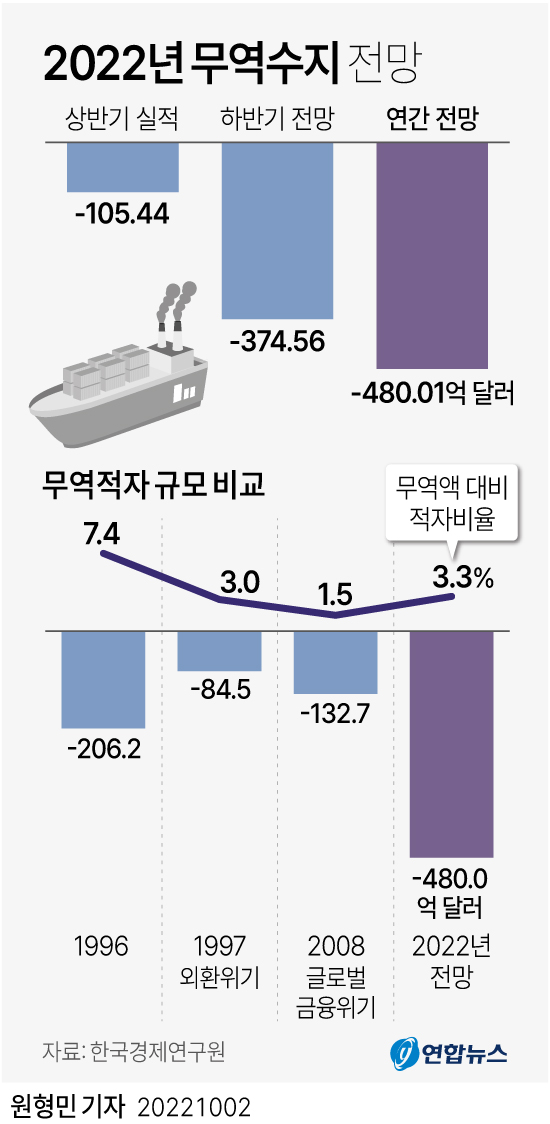 지난 2일 한국경제연구원이 발표한 '2022년 무역수지 전망 및 시사점'을 보면 가파른 수입물가 상승 등 무역수지 악화요인으로 인해 올해 무역적자가 480억 달러(약 68조 7000억 원)로 역대 최대치를 보일 전망입니다. 한국경제연구원은 환율이 빠른 속도로 상승하고 있는데도 무역수지가 악화하는 것은 국제 원자재 가격의 고공행진에 따른 높은 수입물가 영향으로 파악하고 있습니다. 글로벌 금융위기를 맞았던 2008년 중 무역적자 규모는 132억 7000만 달러, 무역액 대비 무역적자 비율이 1.5%였던 것을 떠올리면 상황이 얼마나 좋지 않은지 알 수 있습니다. 이러한 때 외신들과 IMF 역시 아시아의 외환위기를 우려하고 있죠.