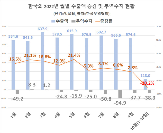 환율은 오르고 주가와 집값은 하락하여 경제가 흉흉한 요즘입니다. 관세청은 10월 1~10일 수출 118억 달러(약 16조 9000억 원, 이하 통관기준 잠정치), 수입 156억 달러로 38억 2500만 달러의 무역수지 적자를 기록했다고 11일 밝혔습니다. 작년과 비교하면 수출액이 20.2%, 수입액이 11.3% 줄었습니다. 월초 잠정 집계치이지만 수출액의 큰 폭 감소에 주목해야 합니다.