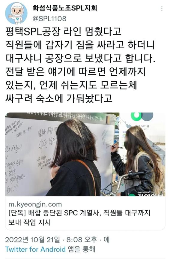 그런데 돈독 오른 SPC는 평택 공장 생산 라인을 세우는 게 마뜩잖았나 봅니다. 노동자의 사망사고로 평택 SPL 공장 라인이 멈추자 사측은 직원들에게 갑자기 짐을 싸라고 통보합니다. 그러더니 제대로 된 설명도 하지 않고 대구에 있는 샤니 공장으로 보냈다고 하죠. 평택 공장이 돌아가지 않으니 거기 가서 작업 할당량을 채우라는 겁니다. 동료의 사망 사고만으로도 정신적 충격이 상당한 노동자들에게 생활 터전인 평택을 떠나 하루아침에 대구로 가라는 요구를 한 것이니, 이를 대체 어떻게 이해해야 할지 모르겠습니다. 심지어 사측은 이들이 언제까지 대구에 있어야 하는지, 쉬는 날은 언제인지도 알려주지 않은 채 싸구려 숙소에 머물게 했습니다.