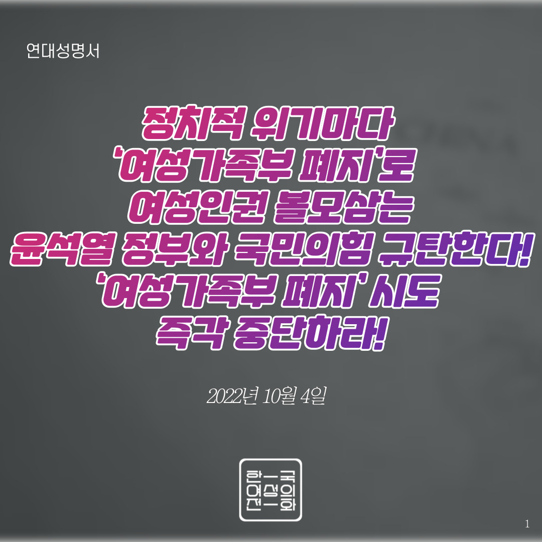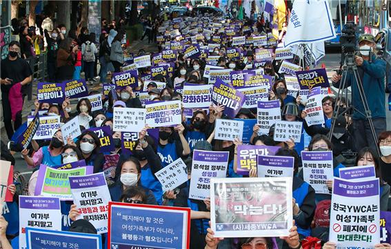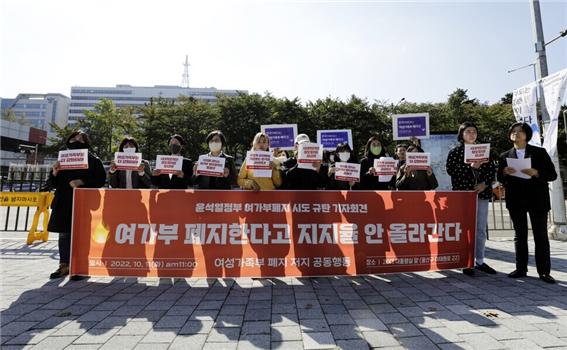 2022년 10월 4일 전국 286개 여성시민사회단체가 연대성명서를 발표했습니다. "'여성가족부 폐지'에 반대하고 여성가족부 강화를 요구하는 목소리는 국내외를 불문하고 결집하여 정부와 국민의힘의 행보를 주시하고 있다"면서 "수만 명의 개인, 전국 643개 여성시민사회단체, 116개 국제시민사회단체는 윤석열 대통령 당선 직후 '여성가족부 폐지' 반대 입장을 밝혔고, 이후 더 다양한 주체들과 함께하며 대응 활동을 이어나가고 있다"라고 밝혔습니다.