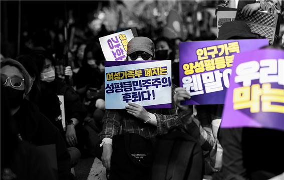 한편 지난 10월 15일 서울 도심에서는 195개 여성, 시민, 노동, 사회단체 주최로 여성가족부 폐지안 규탄 전국 집중 집회가 열렸습니다. 윤석열이 대선 때부터 여성 인권을 정쟁의 도구로 삼고 국민을 기망해온 것과 급기야 여가부를 폐지하기로 한 것을 규탄하는 자리였습니다. 윤석열이 대선공약으로 내세웠던 여가부 폐지는 국민의힘 내부에서도 인정하다시피 '이대남'의 지지를 얻기 위한 정치적 목적이 컸죠. 일부 의견을 국민 전체의 의견인 것처럼 침소봉대하다 여가부 폐지까지 이르렀습니다.