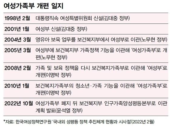여가부 폐지를 우려하는 야당이 다수당이기에 이번 정부조직 개편안이 원안 그대로 통과될 수 있을지는 미지수입니다만 만에 하나 통과가 된다면 여가부는 2000년 김대중 정부 때 출범한 이후 21년 만에 문을 닫게 됩니다. 윤석열 정부는 여가부가 폐지되고 인구가족양성평등본부의 수장인 본부장이 되더라도 장관보다는 낮지만 차관보다는 높은 지위를 부여하고 장관급 국무회의에 배석할 수 있도록 하겠다고 했습니다. 산업통상자원부 통상교섭본부장처럼 말이죠. 그리고 여가부가 담당하던 청소년, 가족, 양성평등, 권익증진은 복지부로, 여성고용 기능은 고용노동부로 이관한다는 계획입니다. 정부 측은 그동안 복지부와 고용부의 정책이 여가부의 정책과 중복되는 부분이 있어 국정상 비효율을 초래했기 때문에 오히려 효율적으로 잘 돌아갈 수 있게 된다는 분석을 내놓았는데요, 과연 그럴까요?