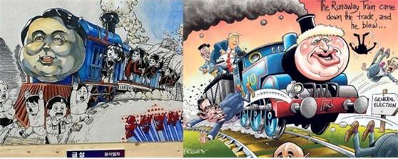 정부의 겁박이 먹히지 않자 국민의힘은 '표절 의혹'을 들먹였습니다. 보수언론들은 앵무새처럼 기사로 받아적었고요. <윤석열차>가 2019년 《더 선》의 논평 기사에 등장한 브렉시트 풍자 일러스트를 표절했다는 주장이었죠. 전체적인 구도는 비슷합니다만 풍자만화의 특성상 이를 오마주 했거나 우리 상황에 맞춰 패러디했다고 보는 편이 적절할 것입니다. 실제로 세계 각국 언론의 해외 만평을 봐도 해당 카툰의 패러디가 차고 넘치니까요.