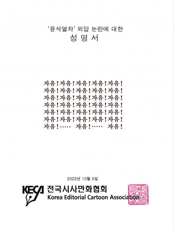 이번 사건에 대해 시사만화협회는 <'윤석열차' 외압 논란에 대한 성명서>라는 제목으로 ‘자유!’만 33번 꽉 채운 논평을 냈습니다. 윤석열이 지난 광복절 경축사에서 광복절에 해야 할 얘기는 제쳐두고 연설 13분 동안 ‘자유’란 단어만 33번 강조한 것을 패러디한 것이죠. 과연 시사만화협회다운 적절한 대응입니다. 이뿐 아니라 7개 만화단체를 비롯한 여러 예술단체와 시민단체 들이 성명을 내어 이는 명백한 차별이며 사상 검열로 양심의 자유와 표현의 자유를 심각하게 침해하는 것이라며, 이번 사태는 사실상 정권 비판적 내용에 대한 검열 메시지를 주입하는 블랙리스트라고 입장을 같이했습니다.