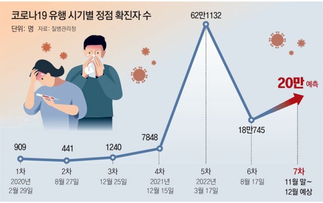 전문가들은 올겨울 유행은 방역 여건상 악재가 많아 피해 규모가 더 커질 수 있다고 우려합니다. 재유행의 베이스라인(출발점)도 1~6차 유행 중에서 가장 높고 정점을 향해 완만하게 확산하는 만큼 유행 기간이 길어질 수 있다는 전망이 나옵니다.