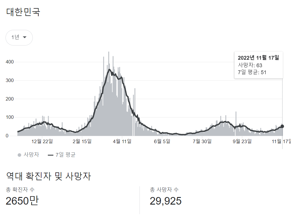 어찌됐든 코로나19가 위험한 병임에는 변함이 없습니다. 위중증 환자와 사망자가 한 달 전보다 1.6배, 2배 이상 치솟고 있는 추세고요. 60~70대는 2배, 80대는 10배 치명률이 높아지기 때문에 겨울을 앞두고 고령층은 꼭 백신을 접종하시길 바랍니다. 코로나19가 독감보다 훨씬 무서운 감염병이라는 건 윤석열 정부의 질병청에서도 열심히 얘기하고 있습니다. 이번 동절기 접종률이 60% 이상은 되어야 모두가 최소한의 안전을 지킬 수 있다고 질병청이 읍소하고 있습니다.