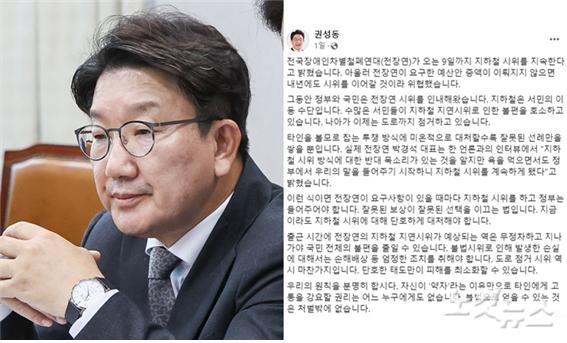 윤핵관인 국민의힘 권성동은 서울시 발표에 더해 망언을 추가했습니다. 전장연 출근길 시위가 예상되는 역은 무정차 통과를 해야 된다고 선동하면서 이로 인해 발생하는 손실에 대한 손해배상 등 엄정한 조치를 취해야 된다고 말입니다. 국민의힘 비대위원인 김상훈 역시 전장연이 이동권을 볼모로 6000억 규모의 예산을 요구하고 있다며 특정 단체가 시민을 볼모로 삼아 수천억 혈세를 좌지우지했다는 선례가 생기면 제2, 제3의 전장연이 안 나온다는 보장이 없다는 망언을 하기도 했죠.