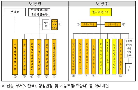 이에 대해 항우연 이상률 원장은 누리호 개발사업을 완수함에 따라 연구, 조직 효율성 제고를 위해 조직 개편을 추진하는 것이라고 설명했습니다. 한국형발사체개발사업본부라는 단일사업 전담 조직을 발사체 분야 종합연구소로 바꾸기 위한 것이라고 합니다. 내년 1월 1일 자로 발사체연구소를 신설하고 이곳에 각 연구부를 두고 기존 본부와 팀들을 흡수 통합한다는 겁니다. 본부 체제와는 달리 팀 단위가 모두 사라졌는데 인사권이 없는 임무 리더가 팀장 역할을 대신하게 됩니다. 사업의 크기가 커졌으니 고도의 효율성과 통합성을 발휘할 수 있도록 개편하겠다는 주장입니다.