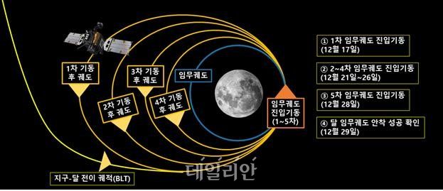 지난 8월 발사된 우리나라의 첫 달 탐사선인 '다누리'가 발사 135일 만인 지난 12월 17일 달 궤도 진입을 위한 1차 기동에 성공했습니다. 한국항공우주연구원과 과학기술정보통신부는 다누리가 지난 17일 새벽 2시 45분 달 궤도 진입을 시작해 1차 기동을 계획대로 정상 수행했다고 발표했습니다. 다누리가 달 중력에 포획돼 달 궤도를 도는 진정한 달 궤도선이 된 것입니다.