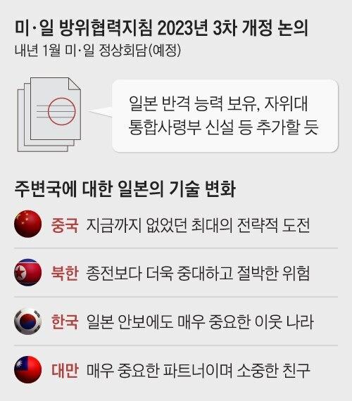 반격 능력 보유를 선언한 일본은 새해 들어 이를 실행에 옮기고 있습니다. 언론은 기시다 총리가 곧 미국을 찾아 바이든 대통령에게 직접 설명하고 유사시 양국이 더 밀착하는 방향으로 재조정할 것으로 보인다고 보도했습니다. 이처럼 일본은 전쟁 가능 국가를 명백히 선언하며 제국주의 시대에 고통을 주었던 아시아 국가들에 대해 실질적인 위협을 가하기 시작했습니다. 그런데 윤석열 정부는 이를 견제하기는커녕 손을 놓은 채 일본을 두둔하기까지 하고 있으니 대한민국의 미래가 참으로 암울합니다.