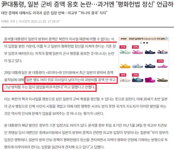 미국과 일본 양국의 이해타산이 맞아떨어졌으니 백번 양보해 그럴 수 있다고 칩시다. 하지만 제국주의 일본의 식민지를 겪은 우리나라 대통령이 일본의 군비 증강을 두둔하는 듯한 말을 흘리는 건 큰 문제입니다. 윤석열 대통령은 지난 11월 29일 로이터 통신과의 인터뷰에서 "일본 열도 머리 위로 미사일이 날아가는데 국방비를 증액 안 하고 그냥 방치할 수는 없지 않았을까(추측한다)"라며 일본의 방위비 인상을 이해한다는 뉘앙스를 풍겼습니다.
