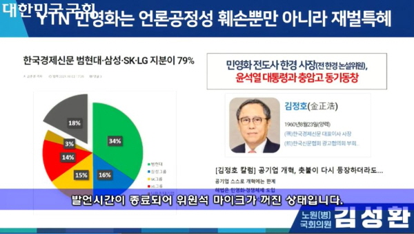 실제로 2022년 11월 18일 박성중 국민의힘 의원은 한 방송에서 "YTN은 민주당 편에 섰다. 반성해야 한다"며 그 속내를 드러내기도 했습니다. 또한 YTN 사영화 논의가 가시화하자 윤석열과 국민의힘의 입장을 받아쓰기해주는 《한국경제》가 YTN 지분을 5%가량 공개 매수하는 등 인수에 적극적이라는 점도 주목해야 합니다. 김성환 더불어민주당 의원은 2022년 10월 4일 국정감사 자료를 통해 "(한전KDN이 보유한 YTN 지분의)무리한 매각 압박의 배경에는 산업통상자원부 혁신TF 민간위원 구성을 주목할 필요가 있다"며 "민간위원 과반수가 정부·여당 소속이거나 민영화론자, 또는 한국경제신문과 밀접한 인사들로 구성된 문제"라고 짚었습니다. 《한국경제》는 9월 16일 YTN 지분을 5%까지 추가 매입했으며, 공교롭게도 같은 날 한전KDN이 YTN 지분 매각 관련 의견을 수정했죠. 지분을 5% 이상 보유할 시 내부경영상황을 열람할 수 있어, 《한국경제》가 YTN 인수를 위한 사전작업에 들어간 것이 아니냐는 분석이 나왔습니다.