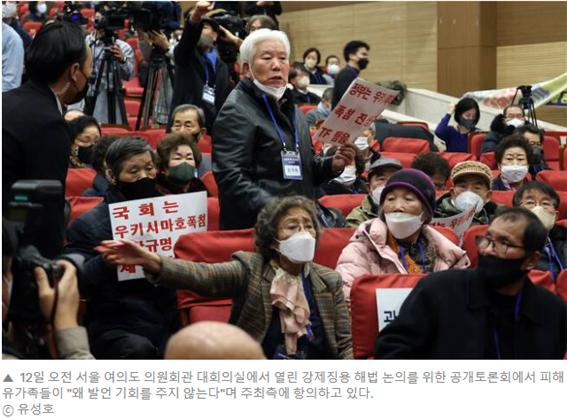 그런데 윤석열 정부는 강제징용 피해자들의 의견을 청취했다는 요식 행위는 하고 싶었나 봅니다. 지난 12일 공개토론회장에 강제징용 피해자들이 발언을 위해 일부 참석한 상태였으니까요. 참석 자체가 굴욕이라고 생각한 일단의 피해자들은 불참을 선언하기도 했습니다. 그나마 당일 참석한 피해자 8명에게 주어진 발표 시간도 5분에 불과했습니다. 이런 상황을 보면 의견을 청취하는 게 목적이 아니라 요식 행위로 그들의 참석이 필요했을 뿐이었다는 걸 알 수 있죠. 결국 광주에 계신 피해자인 양금덕 할머니는 인터뷰를 통해 그런 돈 받지 않겠다, 내가 동냥하는 사람이냐고 하며 명확하게 입장을 밝혔습니다.