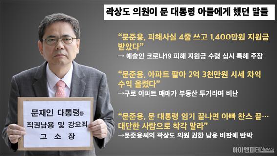 곽상도 전 의원은 문재인 대통령 재임 당시 아들 문준용 씨에 대해 아빠 찬스에 진절머리난다며 맹공격을 퍼부은 바 있습니다. 윤핵관 장제원도 자식 관련 발언으로 자기가 내뱉은 말과 싸워야 했는데, 곽상도 역시 마찬가지 아니겠습니까?