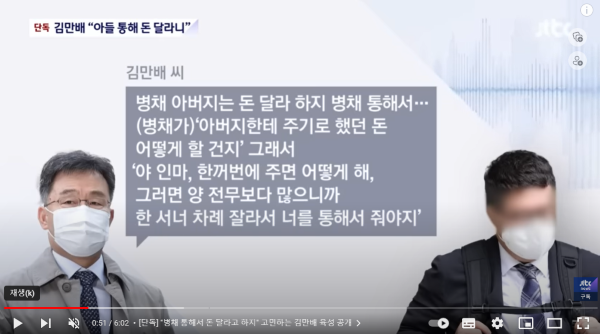 지난 9일 JTBC는 김만배가 경기도 성남의 한 카페에서 이른바 대장동 일당 중 한 명인 정영학 회계사를 만나 곽상도에 대해 나눈 대화 내용을 공개했습니다. 김만배가 곽병채를 통해 곽상도 전 의원에게 돈을 건네겠다고 하는 내용이 담긴 음성 녹취파일이었습니다. JTBC는 "병채 아버지는 돈 달라 하지 병채 통해서..."라며 "(병채가) '아버지한테 주기로 했던 돈 어떻게 할 건지' 그래서 '야 인마, 한꺼번에 주면 어떻게 해, 그러면 양 전무보다 많으니까 한 서너 차례 잘라서 너를 통해줘 줘야지'"라고 말하는 김만배의 음성을 보도했습니다. 한편 JTBC는 김만배가 유동규 전 성남도시개발공사 본부장과도 비슷한 대화를 나눴다고 전했습니다. 공개된 녹취파일을 보면 김만배는 "아들(병채)은 회사 막내인데, 50억을 어떻게 가져가려고"라고 말합니다. 그러자 유 전 본부장이 "곽 선생님은 변호사 아녜요?"라며 "현역이잖아요, 정치자금법 문제가 될 텐데"라고 반응합니다. 김만배는 이어 "아니 아들한테 주든 뭐든"이라고 말했고, 유 전 본부장은 "아들한테 주는 수밖에 없어요. 아들이 그렇게 받아갔다고 하면 나중에 아들 문제가 불거질 수 있어요"라고 화답합니다. 그러고는 두 사람은 곽상도에게 문제가 생기지 않도록 돈을 줄 방법에 대해서도 의견을 나눕니다. 김만배는 "그거는 형이 기술적으로 잘 할 테니까"라며 "OOO하고 곽상도 아들은 여기 50억 넣지도 않았어. 비용이 5억씩 넣었어. 그치?"라고 말합니다. 유 전 본부장은 "5억씩 주는 것도 문제가 될 거 같은데"라고 하자, 김씨가 "다른 사람들도 그만큼 가져가기 때문에"라고 답합니다. 이에 대해 유 전 본부장은 "직원들한테 돈 벌어서 보너스 줬다?"라고 호응합니다. 두 사람이 이런 대화를 나누고 6개월 뒤인 2021년 4월 곽병채는 성과급과 위로금을 포함해 퇴직금 50억 원, 실수령액으로 25억 원을 회사에서 수령했습니다.