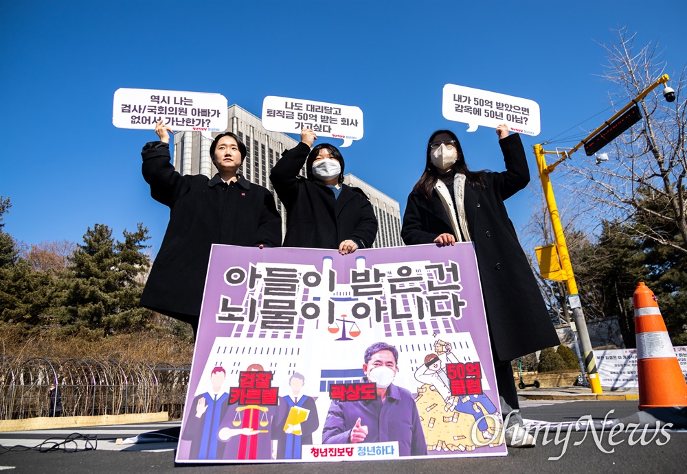 이들은 "역시 나는 검사/국회의원 아빠가 없어서 가난한가?", "나도 대리 달고 퇴직금 50억 받는 회사 가고 싶다", "내가 50억 받았으면 감옥에 50년 아님?"이라고 쓴 팻말을 들고 곽상도 아들이 받은 것이 과연 뇌물이 아니었는지 되물었습니다. 아울러 청년들은 사법부가 곽상도 전 의원의 무죄 판결을 뒤엎고 엄중하고 공정한 판결로 이 사회가 살아 있다는 것을 알려주기를 바란다고 촉구했습니다. 한편 "윤석열 대통령이 상식과 공정의 사회를 원한다면, 비상식과 불평등에 분노하는 청년들을 위해 곽상도 50억 특검을 실시할 것"을 촉구하기도 했습니다.
