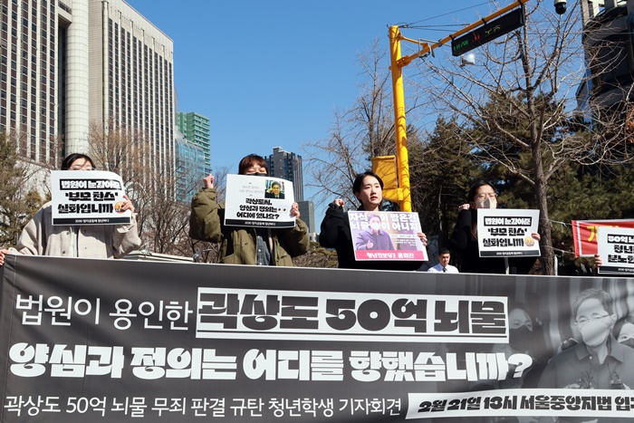 청년진보당과 청년 학생들이 '국민의 힘 곽상도 전 국회의원의 50억 뇌물 혐의 무죄 판결'에 대해 납득할 수 없다며 21일 서울중앙지법 정문에서 이를 규탄하는 기자회견을 열었습니다. 청년진보당 홍희진 대표는 "국회의원 아들에게 퇴직금으로 50억을 준 것도 충격인데, 사법부가 무죄판결을 내리는 걸 보며 청년들은 국가에 대한 최소한의 신뢰조차 잃어버렸다"면서 "50억 클럽에서 곽상도를 제외한 나머지 고위급 검판사 출신은 대놓고 봐주고, 곽상도 마저도 무죄가 나오도록 허술한 수사를 한 건 검찰"이라며 규탄했습니다.