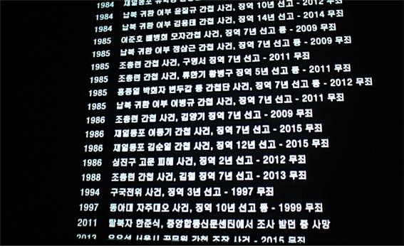 지난 2016년 국정원의 간첩 조작 사건을 추적해서 내놓은 최승호 PD의 다큐멘터리 영화인 <자백>만 봐도 알 수 있죠. 마지막 5분이 넘게 흐르는 엔드 크레디트 내용은 이름은 다르지만, 사실상 내용은 죄다 똑같은 사건입니다. 굵직한 것들로만 넣었을 텐데도 그렇습니다. 모두 최종 무죄 판결이 났거나 수사 도중 사망해 진실을 알 수 없어진 간첩 조작 사건들 목록이죠. 70여 년에 걸친 원죄가 있는 국정원이다 보니 간첩단이 나타났다는 얘길 하는데도 믿음이 가기보다는 의심부터 드는 건 왜일까요?