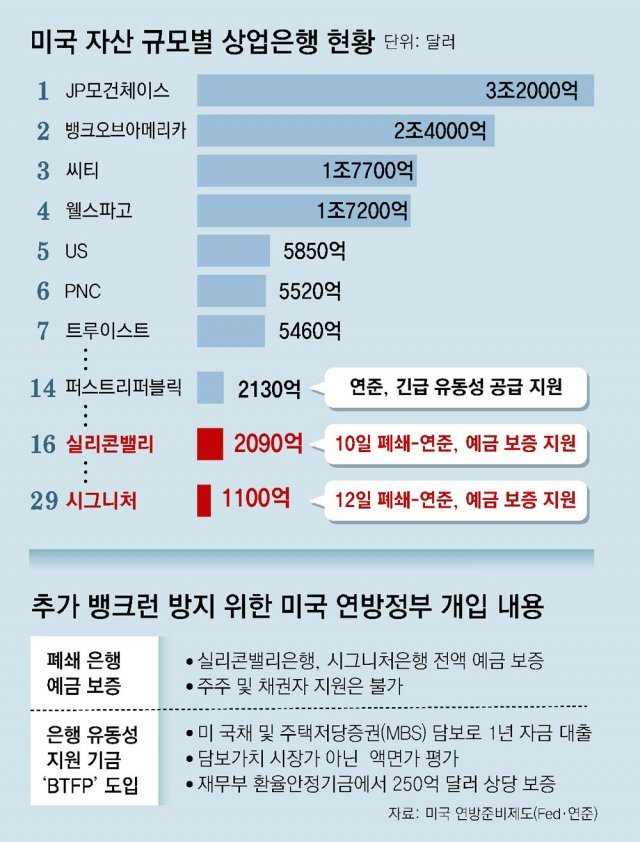 미국이 기침을 하면 세계는 독감에 걸린다는 말이 있습니다. SVB 파산 사태를 비관적으로 보는 쪽에선 이미 파장이 세계로 퍼지고 있다고 우려합니다. 미국 은행의 파산 여파가 일주일 만에 스위스에 이어 독일의 최대 은행인 도이체방크 위기설로 번졌으니까요. 독일 총리가 도이체방크가 흔들릴 일은 없다고 나서서 강조해야 할 정도로 세계 경제의 위기감이 높아지고 있는 것도 사실입니다. SVB의 사업 구조가 특이해서 일반 은행과 다르다고 해도 규모가 작은 은행이 아니었다는 사실도 우려되는 지점입니다. SVB 자산규모는 2090억 달러로 미국 전체 2124개 상업은행 중 16번째였습니다. 1위인 JP모건과 뱅크오브아메리카의 자산이 3.2조, 2.4조 달러라는 점에 비춰보면 10% 수준밖에 안 됩니다. 하지만 달리 보면 SVB 규모가 16번째일 정도로 지역은행의 상황이 열악하다는 얘기가 됩니다.