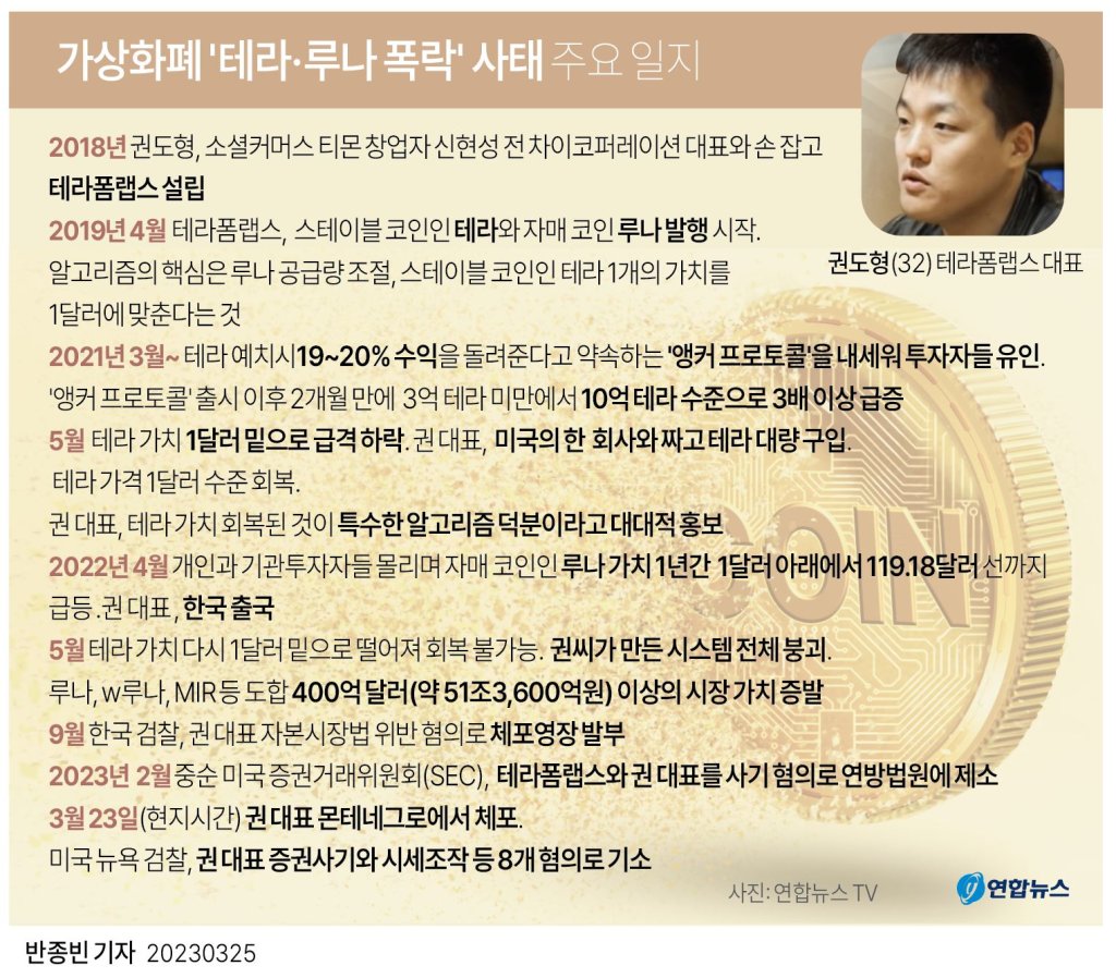 지난 24일 몬테네그로 경찰은 국제적으로 적색수배된 권도형을 현지에서 체포했다는 소식을 알렸습니다. 권도형은 사상 최대의 암호화폐 사기라고 불리는 루나-테라 코인 개발사인 테라폼랩스의 대표로서 투자자들에게 400억 달러, 우리 돈으로 약 52조 원에 달하는 피해를 입힌 혐의로 지명 수배 중이었습니다. 한국 경찰청은 몬테네그로 현지에서 지문 자료를 받아 권도형의 신원을 확인한 것으로 알려졌고 미 검찰 당국도 수십억 달러 규모의 암호자산 증권 사기를 계획한 혐의로 권도형을 기소하고 나섰습니다.