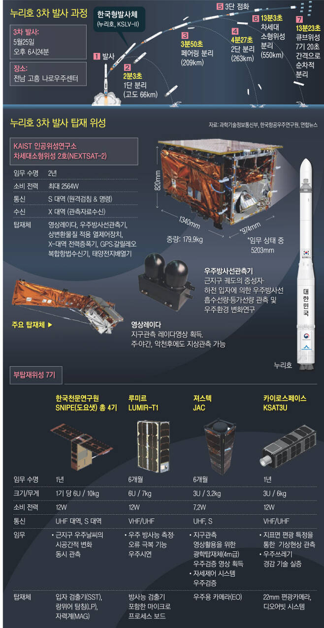 우주항공 업계 전문가들은 이번 발사의 실용 위성 사출이 성공적이었다고 평가합니다. 발사 전 위성 사출 예상 시간과 실제 사출 시간의 차이가 10초도 나지 않았고, 당초 계획처럼 약 20초 간격으로 위성이 분리됐기 때문입니다. 계획대로 실현되었다는 얘기입니다. 항우연은 위성 간의 충돌을 막기 위해 0.2도씩 기울여 사출하고 차세대 소형위성 2호를 중앙에 두고 양 옆에 큐브 위성 7기를 나눠서 배치했습니다. 이는 국내에서 처음 시도하는 방식으로 사출 간격이 짧은 만큼 위성의 동선을 고려한 배치였다고 합니다.