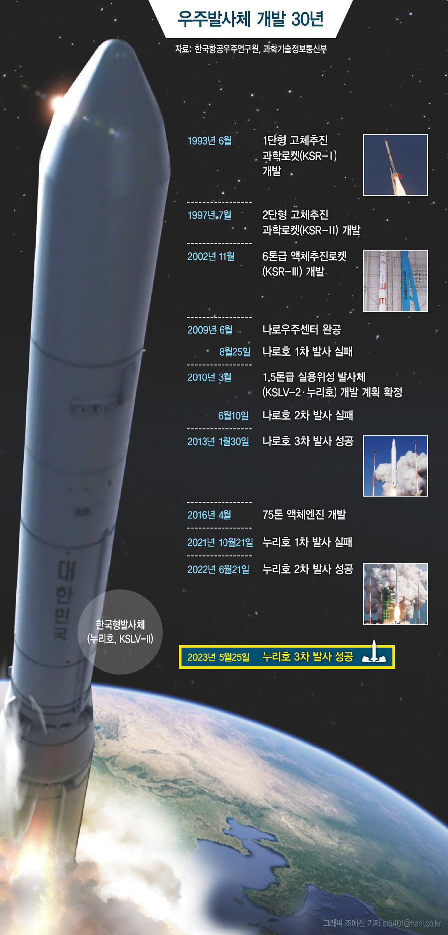 누리호가 3차 발사부터 위성 분리까지 모든 과정을 성공적으로 마쳤습니다. 이로써 대한민국은 실용 위성을 자체 개발 발사체로 쏘아 올릴 수 있는 명실상부한 우주 개발 국가의 일원이 되었습니다. 자체 제작한 위성을 자체 제작한 발사체에 탑재해 우주 궤도로 올린 나라는 현재까지 미국, 프랑스, 일본, 러시아, 중국, 인도밖에 없습니다.