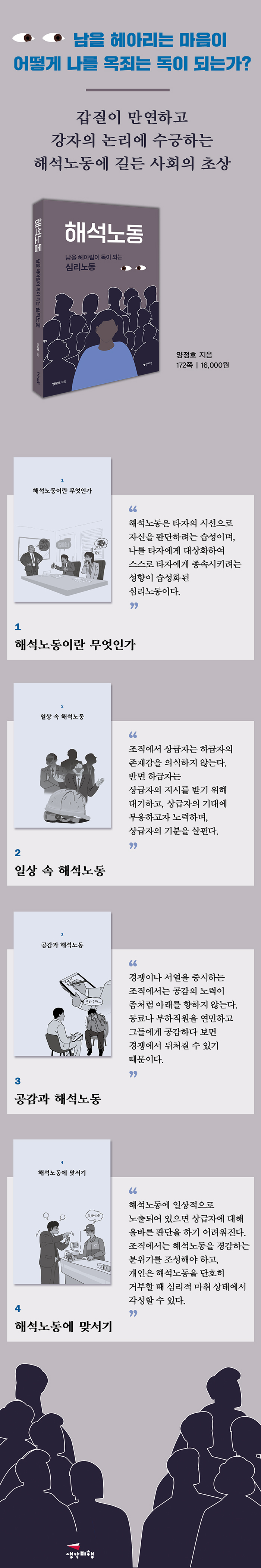 《해석노동》은 해석노동의 개념을 제시하고 우리가 부지불식간에 해석노동을 하고 있음을 인지하게 하는 데 목적이 있습니다. 1장에서는 해석노동의 개념을 소개합니다. 2장에서는 일상에서 해석노동을 유발하는 사례를 다루고, 해석노동을 조장하는 여건을 확인해 봅니다. 3장에서는 공감을 통해 해석노동을 받아들이는 방식이 모방이며, 해석노동의 확산이 인간의 공감력을 발판으로 이루어짐을 설명합니다. 공감의 어두운 면에 주의를 기울여야 하는 이유죠. 마지막으로 4장에서는 공감 격차에 관해 설명합니다. 해석노동 수혜자와 해석노동자 사이에는 공감 격차가 존재합니다. 하급자의 입장을 고려할 필요가 없고 그 입장에 서본 경험이 없는, 해석노동의 수혜자일수록 꼰대거나 갑질을 하는 사람일 가능성 농후합니다.