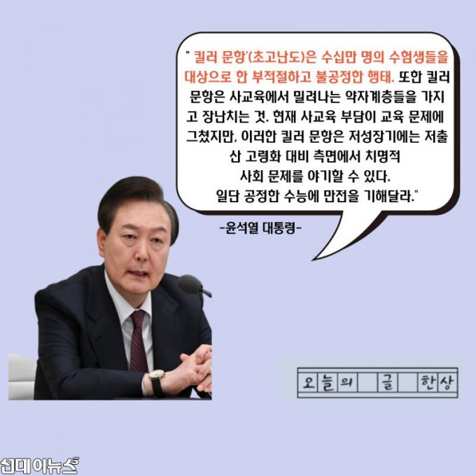 지난달 2024학년도 대학수학능력시험이 끝나자 수험생들이 느낀 감정은 분노와 허탈감이 아니었을까 짐작해봅니다. '킬러문항'과 '사교육비 경감' 등 많은 말이 횡행한 가운데 치러진 이번 수능은 역대급 불수능이었으니 말입니다. 언론 보도를 보면 올해 수능은 의대 열풍, 킬러문항 배제의 영향으로 27년 만에 졸업생 응시자 비율이 가장 높았다고 하죠. 고난도 킬러문항이 없어 '물수능'이 되리라는 예측과 달리 국어와 수학 영역이 어렵게 출제되면서 재수생이 수능 성적 우위를 앞세워 대입 정시 전형에서 고3 재학생보다 두각을 보이는 현상이 심화할 수 있다는 전망이 나옵니다. 이 사달의 제공자는 윤석열 대통령이었습니다. 지난 6월 윤석열 정부와 국민의힘아 뜬금없이 사교육비 유발 주범이 수능의 이른바 '킬러 문항(초고난도 문제)'라고 지적했으니까요.