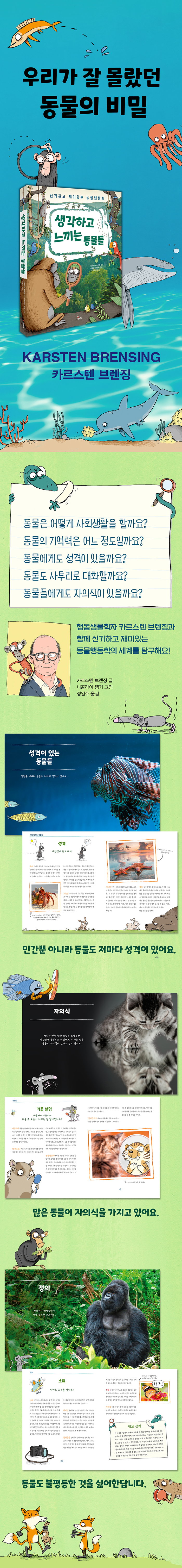 《생각하고 느끼는 동물들》의 저자 카르스텐 브렌징은 동물행동학이라는 흥미로운 관점으로 인간 정신이 진화를 거치며 어떻게 발전했는지 우리에게 재미있게 알려 줍니다. 인간이 동물보다 많은 점에서 앞서는 것은 사실이지만, 완벽하지 않으며 지구 생태계 안에서 숱한 생명과 공생하며 살아가야 한다고 이야기합니다.